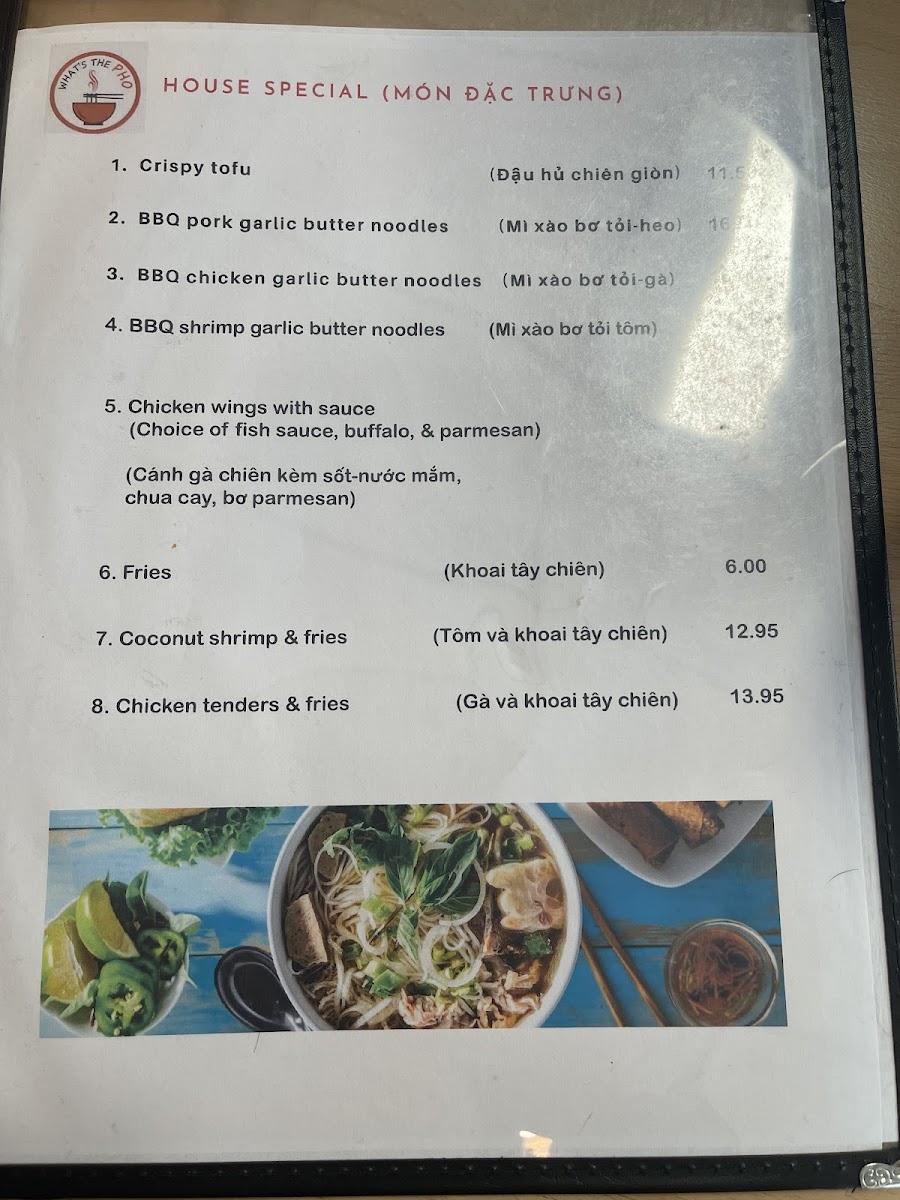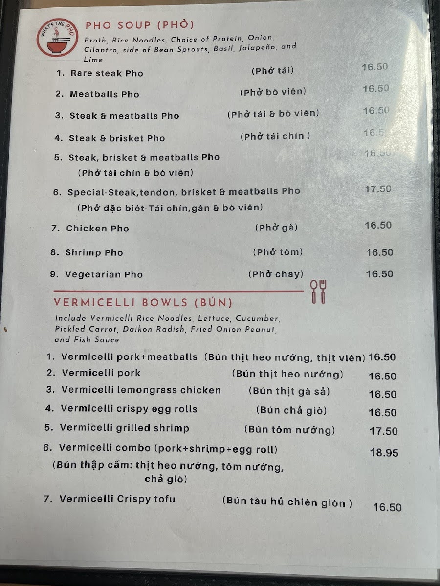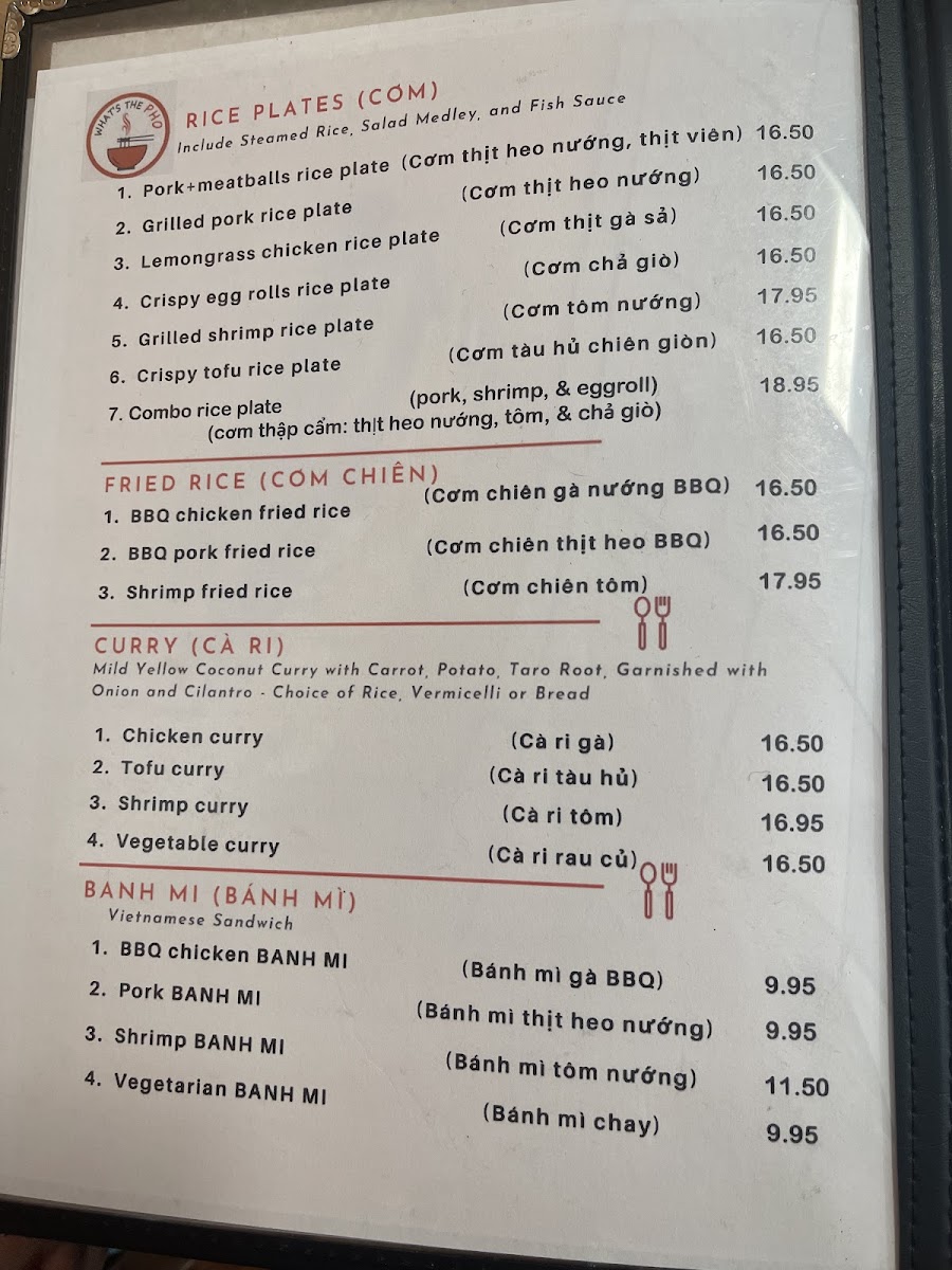 The menu at What's The Pho offers a variety of traditional Vietnamese dishes, with a focus on pho, noodle dishes, and other regional specialties. It is organized into several main categories to accommodate different meal preferences throughout the day.