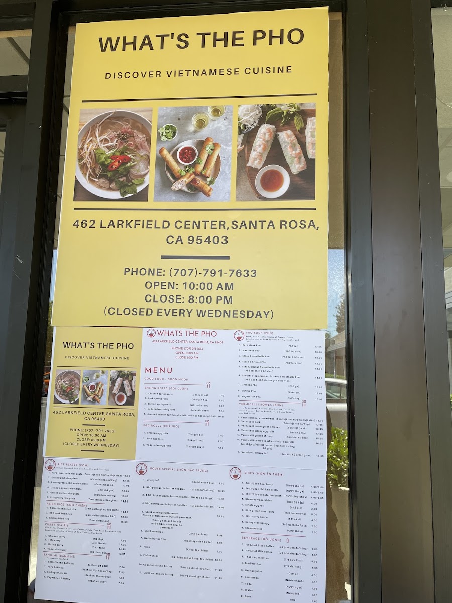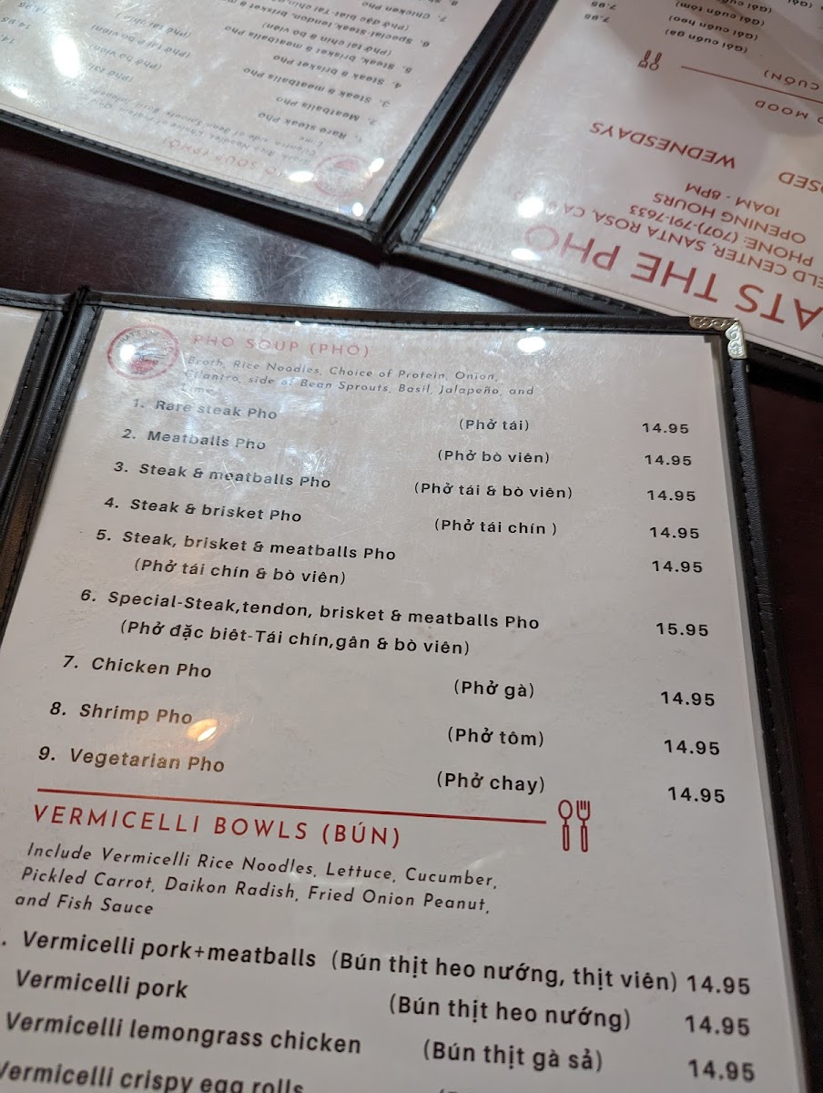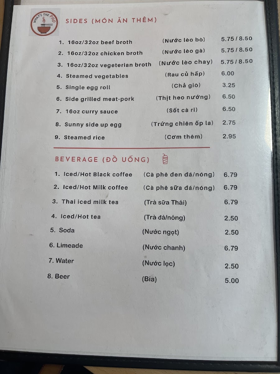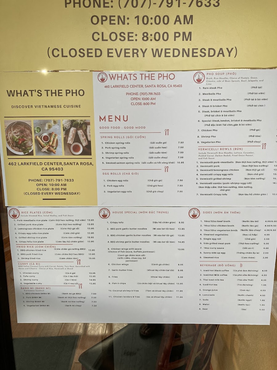 The menu at What's The Pho offers a variety of traditional Vietnamese dishes, with a focus on pho, noodle dishes, and other regional specialties. It is organized into several main categories to accommodate different meal preferences throughout the day.